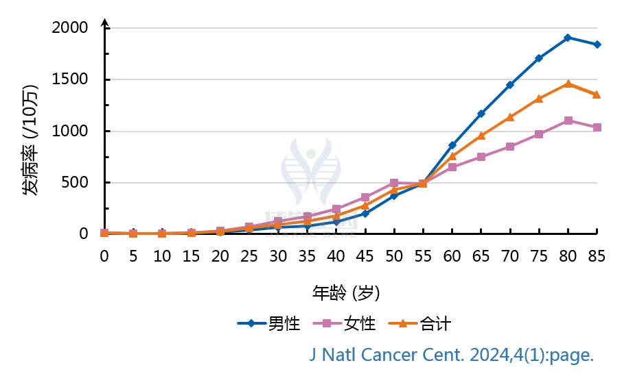 全癌种的发病率在0-34岁年龄组相对较低,从35-39岁年龄组开始显著增加,在80-84岁年龄组达到峰值。 -
